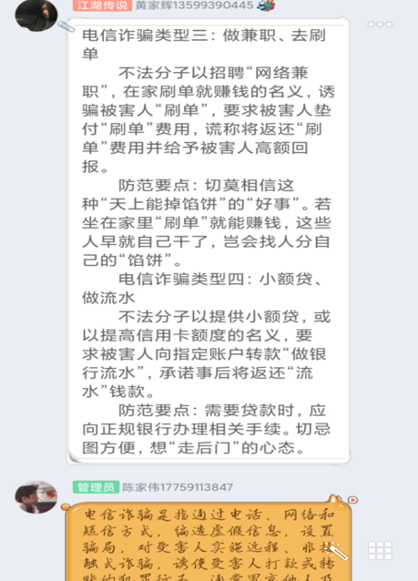 薛凌志,19計(jì)算機(jī)網(wǎng)絡(luò)技術(shù)1班學(xué)生,入讀大學(xué)之前做過(guò)輔警,接觸過(guò)網(wǎng)絡(luò)詐騙的案件,參加過(guò)網(wǎng)絡(luò)詐騙培訓(xùn),對(duì)網(wǎng)絡(luò)詐騙有一定了解。為此,信息系決定開(kāi)展一次線上防詐騙主題宣傳,由薛凌志擔(dān)任宣講人。全部以學(xué)生為主的線上防詐騙宣傳是一個(gè)全新嘗試,在輔導(dǎo)員和班主任的指導(dǎo)下,由薛凌志同學(xué)制定宣講計(jì)劃,構(gòu)建15種詐騙類型框架,同時(shí)輔以案例強(qiáng)化理解。為期三個(gè)晚上的宣講既注重重點(diǎn)講解,又注重過(guò)程互動(dòng),學(xué)生反響強(qiáng)烈。根據(jù)反饋,各班級(jí)QQ群上線率、參與率平均達(dá)90%,宣傳效果良好。