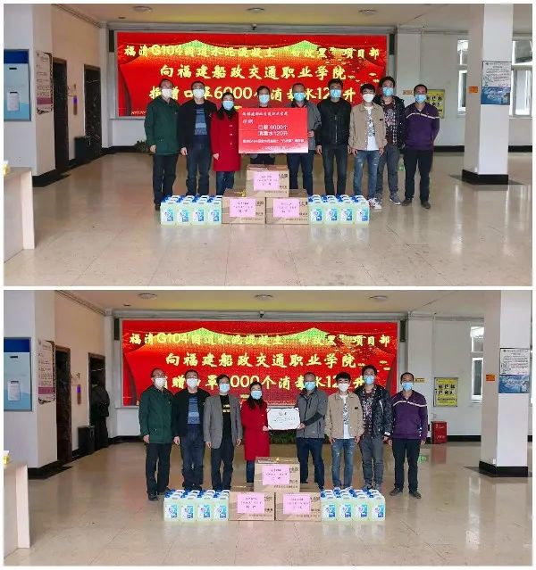 黃育妙校友代表福清G104國道水泥混凝土“白改黑”項(xiàng)目部向?qū)W院捐贈一次性防護(hù)口罩6000個、消毒水120升。