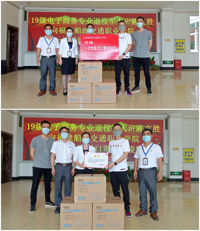 514日上午,19級(jí)電子商務(wù)專(zhuān)業(yè)退役軍人班陳文勝同學(xué)向?qū)W院捐贈(zèng)一次性醫(yī)用口罩5000個(gè)。學(xué)院黨委副書(shū)記陳宜大、副院長(zhǎng)陳艷紅代表學(xué)院接收了該批物資。