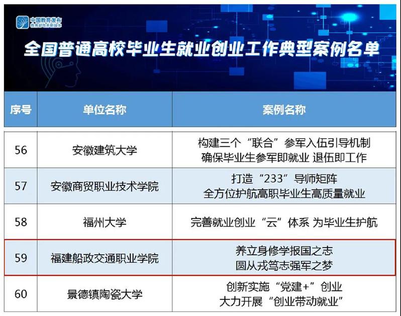 11月26日,教育部發(fā)布公告,公布了100個全國普通高校畢業(yè)生就業(yè)創(chuàng)業(yè)工作典型案例,我院《養(yǎng)立身修學(xué)報國之志 圓從戎篤志強軍之夢》案例成功入選,成為福建省唯一入選的高職院校。
