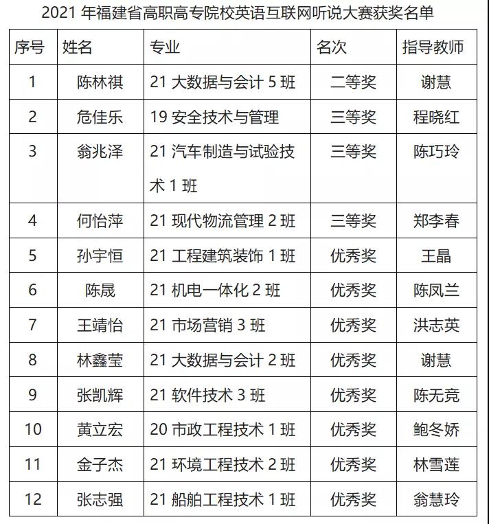 近日,2021年福建省高職高專院校英語互聯(lián)網(wǎng)聽說大賽圓滿結束,我院取得二等獎1項、三等獎3項、優(yōu)秀獎8項的好成績,并榮獲“優(yōu)秀組織獎”稱號。