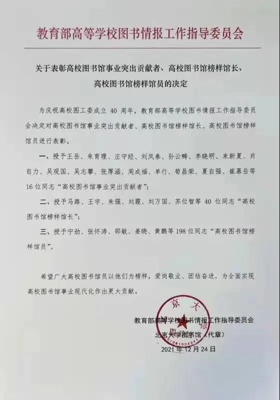 祝賀圖書館解露路老師榮獲教育部高等學(xué)校圖書情報工作指導(dǎo)委員會“高校圖書館榜樣館員”榮譽稱號!