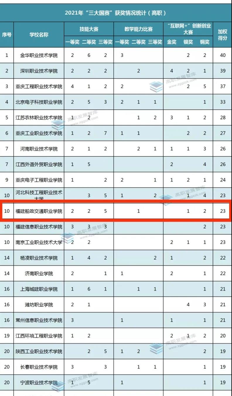 近期,高職發(fā)展智庫對三個(gè)賽項(xiàng)獲獎(jiǎng)的有效數(shù)據(jù)進(jìn)行統(tǒng)計(jì)與分析,福建船政交通職業(yè)學(xué)院表現(xiàn)亮眼!進(jìn)入全國排名前十!