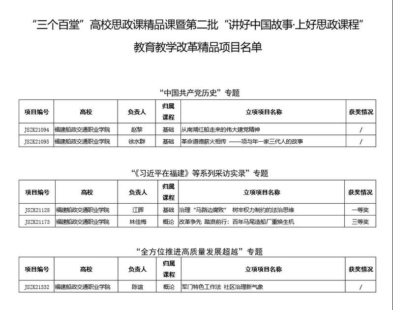 據(jù)悉,此次福建省“三個百堂”高校思政課精品課,以講述中國共產(chǎn)黨歷史、《習(xí)近平在福建》等系列采訪實(shí)錄、全方位推進(jìn)高質(zhì)量發(fā)展超越為主要題材,共360堂,已作為教育教學(xué)改革精品項(xiàng)目予以立項(xiàng),其中按專題擇優(yōu)評選一等獎項(xiàng)目10項(xiàng)、二等獎項(xiàng)目20項(xiàng)、三等獎項(xiàng)目30項(xiàng)。