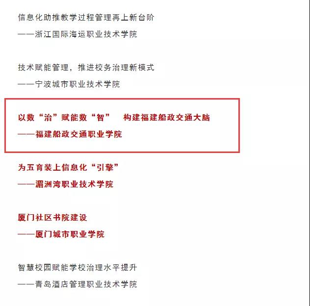 近日,中央電化教育館公布職業(yè)院校信息化建設(shè)與應(yīng)用成果案例征集結(jié)果,我院報(bào)送的信息化治理與服務(wù)案例《以數(shù)“治”賦能數(shù)“智” 構(gòu)建福建船政交通大腦》成功入選,成為福建省入選的三所高職院校之一。此次案例征集得到全國職業(yè)院校積極響應(yīng),經(jīng)過專家初審和終審,最終遴選出108個(gè)典型案例。