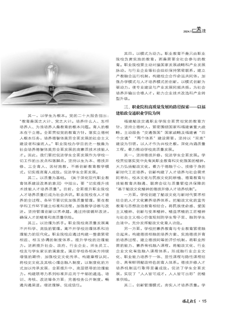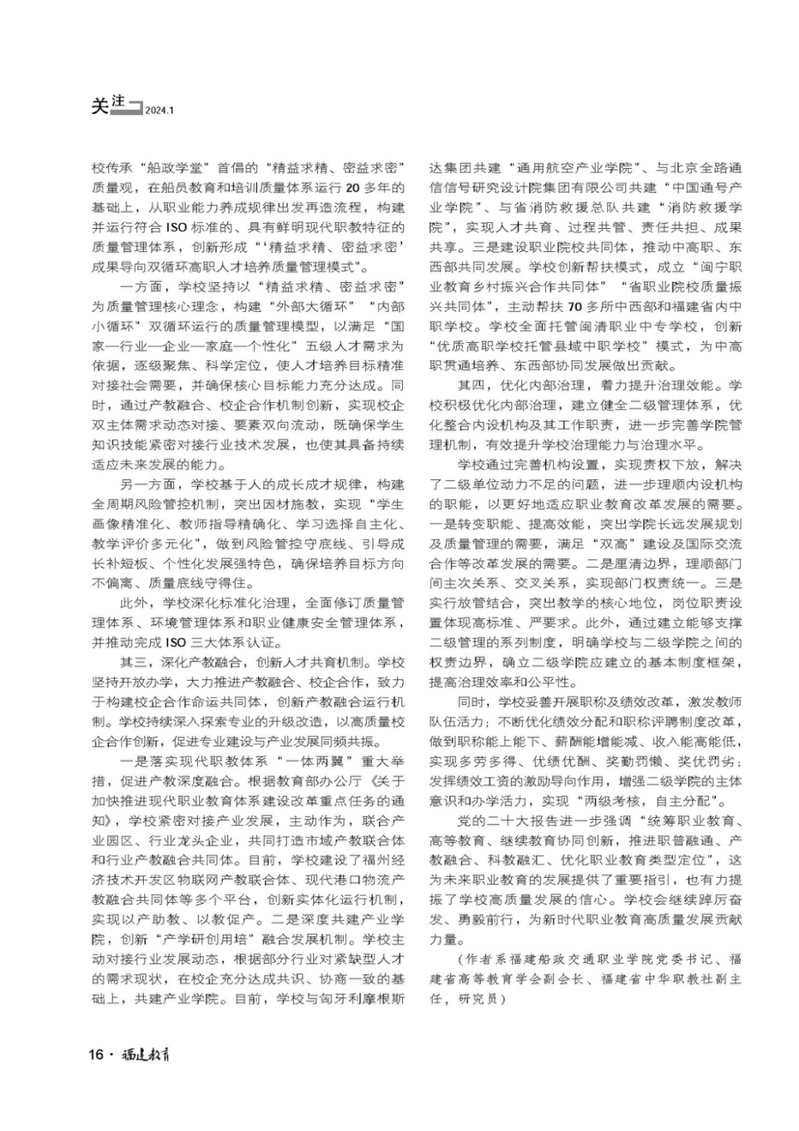 福建省教育廳主管、福建教育雜志社主辦的教育專(zhuān)業(yè)期刊《福建教育》2024年第4期“關(guān)注”職業(yè)教育高質(zhì)量發(fā)展筆談欄目,刊發(fā)了學(xué)院黨委書(shū)記陳宜大筆談文章,對(duì)職業(yè)教育高質(zhì)量發(fā)展的目標(biāo)、內(nèi)涵、路徑、策略等進(jìn)行深入探討,內(nèi)容如下: