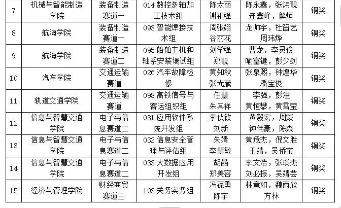 在激烈的競賽中,我院學(xué)子沉著冷靜,發(fā)揮出色,勇獲佳績。在會計(jì)實(shí)務(wù)、電子商務(wù)2個(gè)賽項(xiàng)榮獲金獎,在生產(chǎn)事故應(yīng)急救援、智能飛行器應(yīng)用技術(shù)、智能網(wǎng)聯(lián)汽車技術(shù)、機(jī)器人系統(tǒng)集成應(yīng)用技術(shù)4個(gè)賽項(xiàng)榮獲銀獎,在數(shù)控多軸加工技術(shù)、智能焊接技術(shù)、船舶主機(jī)和軸系安裝調(diào)試、汽車故障檢修、高鐵信號與客運(yùn)組織、應(yīng)用軟件系統(tǒng)開發(fā)、信息安全管理與評估、大數(shù)據(jù)應(yīng)用開發(fā)、關(guān)務(wù)實(shí)務(wù)9個(gè)賽項(xiàng)榮獲銅獎,獲獎數(shù)量位居全省第一。同時(shí)受我院邀請,由烏干達(dá)工程機(jī)械技能培訓(xùn)中心組成的國際代表隊(duì),在我院汽車學(xué)院黃林火老師的指導(dǎo)下,榮獲交通運(yùn)輸賽道起動系統(tǒng)故障排查小組銅獎。