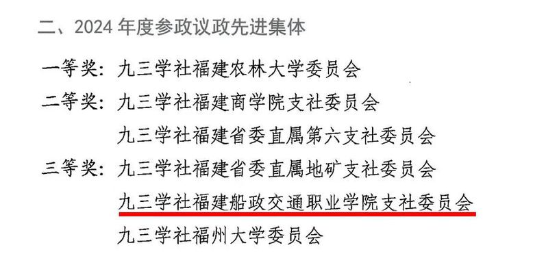 近日,九三學(xué)社福建省委員會直屬工作委員會表彰2024年度各項(xiàng)社務(wù)工作先進(jìn)集體和先進(jìn)個(gè)人,九三學(xué)社福建船政交通職業(yè)學(xué)院支社委員會榮獲2024年度參政議政先進(jìn)集體三等獎(jiǎng),支社主委鄒澤昌、副主委陳樂天榮獲2024年度優(yōu)秀社員。