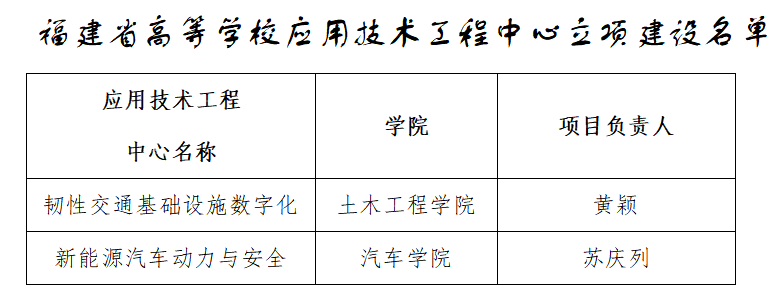 近日,從福建省教育廳獲悉,我院土木工程學院黃穎和汽車學院蘇慶列2位院長牽頭主持申報的科研平臺團隊獲批福建省高等學校應用技術(shù)工程中心立項建設。