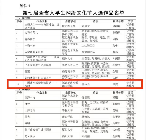 日前,中共福建省委教育工委、中共福建省委網(wǎng)信辦公布第七屆全省大學(xué)生網(wǎng)絡(luò)文化節(jié)和全省高校網(wǎng)絡(luò)教育優(yōu)秀作品推選展示活動(dòng)獲獎(jiǎng)結(jié)果。由我院航海學(xué)院林沛杰同學(xué)創(chuàng)作的微視頻《中國(guó)水密隔艙制造技藝——福船》獲微視頻類別“優(yōu)秀推薦作品”獎(jiǎng)項(xiàng)。