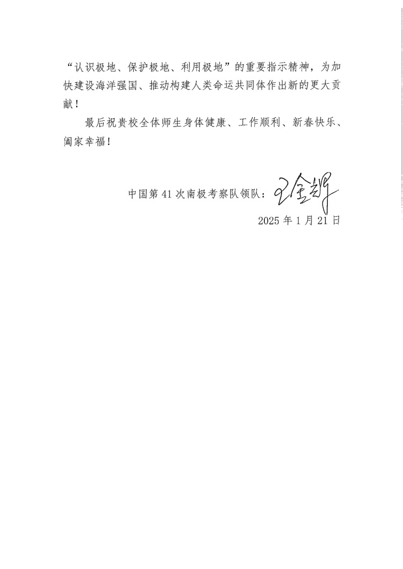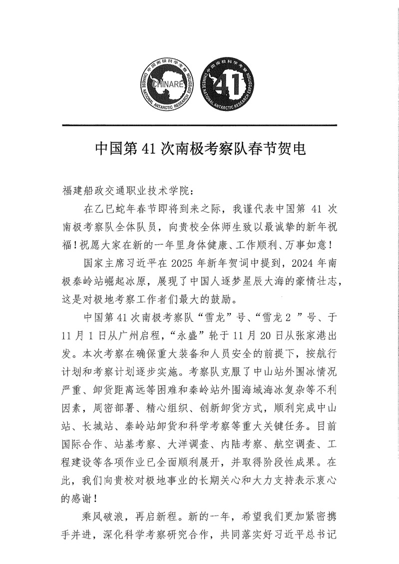 近日,遠在南極執(zhí)行科學考察任務的中國第41次南極考察隊向我院發(fā)來春節(jié)賀電,感謝我院對極地事業(yè)的長期關(guān)心和大力支持,并向全院師生致以誠摯的節(jié)日問候!