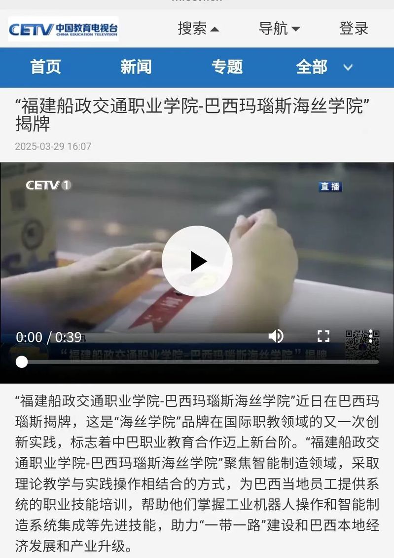 3月29日,中國教育電視臺(tái)報(bào)道我院在巴西設(shè)立“海絲學(xué)院”,標(biāo)志著中巴職業(yè)教育合作邁上新臺(tái)階。正文如下:
