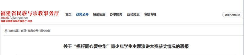 近期,由中共福建省委統(tǒng)戰(zhàn)部、福建省民族宗教廳、福建省教育廳、共青團(tuán)福建省委聯(lián)合舉辦的“福籽同心愛中華”青少年學(xué)生主題演講大賽落下帷幕。本次大賽共評(píng)選出高校組一等獎(jiǎng)3個(gè)、二等獎(jiǎng)6個(gè)、三等獎(jiǎng)12個(gè)、優(yōu)秀獎(jiǎng)19個(gè)。我院選送2個(gè)作品分別榮獲二等獎(jiǎng)、三等獎(jiǎng)。