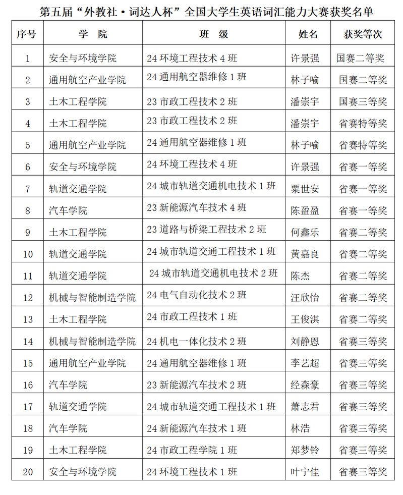 我院共有622名學(xué)生報名參賽,其中63名學(xué)生晉級省賽,17名學(xué)生在省賽中獲獎。經(jīng)過激烈角逐,我院5名學(xué)生晉級國賽,其中,24環(huán)境工程技術(shù)4班許景強、24通用航空器維修1班林子喻榮獲國賽二等獎,23市政工程技術(shù)2班潘崇宇榮獲國賽三等獎。