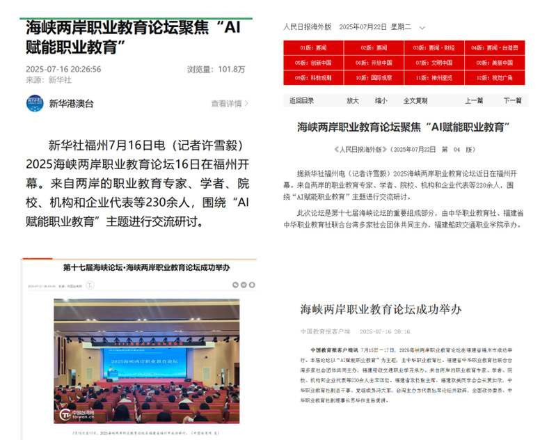 7月15日-17日,2025海峽兩岸職業(yè)教育論壇在福建省福州市成功舉行。此次論壇以“AI賦能職業(yè)教育”為主題,由中華職業(yè)教育社、福建省中華職業(yè)教育社聯(lián)合臺灣多家社會團體共同主辦,福建船政交通職業(yè)學(xué)院承辦,《教育與職業(yè)》雜志社協(xié)辦。論壇期間,第十四屆臺灣青年研習(xí)營暨海峽兩岸青年非遺技藝研學(xué)體驗營同步舉辦。本次論壇獲得了新華社、人民網(wǎng)、中國臺灣網(wǎng)、中國教育報、經(jīng)濟日報、中國新聞網(wǎng)、中華職業(yè)教育社、福建省中華職業(yè)教育社、福建電視臺、同心福建等十多家主流媒體報道。