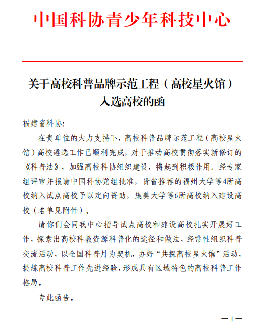 此次入選“高??破掌放剖痉豆こ蹋ǜ咝P腔痧^)”,是對(duì)我院服務(wù)社會(huì)、普及科學(xué)知識(shí)能力的充分肯定。作為建設(shè)高校,學(xué)院將在中國(guó)科協(xié)青少年科技中心與福建省科協(xié)的共同指導(dǎo)下,緊密結(jié)合自身專(zhuān)業(yè)特色與職業(yè)教育優(yōu)勢(shì),整合資源,扎實(shí)推進(jìn),打造具有“船政特色”的科普品牌,力爭(zhēng)將“星火館”建設(shè)成為提升師生及公眾科學(xué)素養(yǎng)、服務(wù)區(qū)域創(chuàng)新發(fā)展的重要平臺(tái),為構(gòu)建高??破展ぷ餍赂窬重暙I(xiàn)力量。
