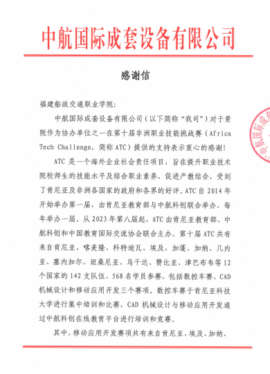 近日,由中航國際成套設備有限公司、肯尼亞教育部和中國教育國際交流協(xié)會聯(lián)合主辦的第十屆非洲職業(yè)技能挑戰(zhàn)賽(Africa Tech Challenge,簡稱“ATC”)圓滿落幕。我院信息與智慧交通學院師生團隊全程護航移動應用開發(fā)賽項,以專業(yè)師資精準授課、青年志愿暖心服務,圓滿完成了線上培訓與技術保障任務,并獲主辦單位中航國際成套設備有限公司專函致謝。