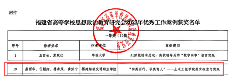 近日,福建省高等學校思想政治教育研究會公布了關于表彰2025年優(yōu)秀工作案例的通知。我院網(wǎng)絡育人工作案例《“向美而行,以美育人”——土木工程學院美育探索與實踐》獲評一等獎。