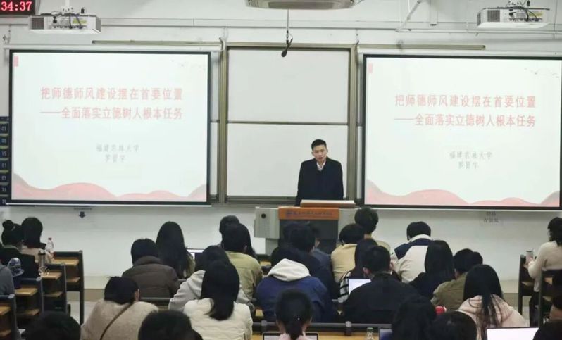 師德師風(fēng)是教師隊(duì)伍建設(shè)的靈魂,福建農(nóng)林大學(xué)馬克思主義學(xué)院羅賢宇教授在《把師德師風(fēng)建設(shè)擺在首要位置——全面落實(shí)立德樹(shù)人根本任務(wù)》專題講座中,報(bào)告深入解讀了新時(shí)代教師職業(yè)行為準(zhǔn)則,結(jié)合典型案例,強(qiáng)調(diào)了筑牢師德底線、關(guān)愛(ài)學(xué)生成長(zhǎng)、恪守學(xué)術(shù)道德的重要性。講座引導(dǎo)新教師們深刻思考“為誰(shuí)培養(yǎng)人、培養(yǎng)什么人、怎樣培養(yǎng)人”這一根本問(wèn)題,激勵(lì)大家爭(zhēng)做“四有”好老師,將立德樹(shù)人根本任務(wù)內(nèi)化于心、外化于行。