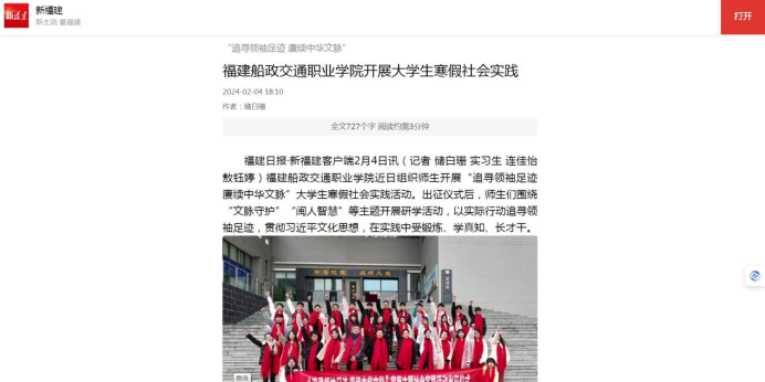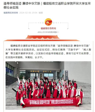 學(xué)院認(rèn)真落實福建省委教育工委要求,統(tǒng)籌部署、協(xié)同開展“追尋領(lǐng)袖足跡 賡續(xù)中華文脈”大學(xué)生寒假社會實踐,成立社會實踐隊,走進(jìn)嚴(yán)復(fù)故居、嚴(yán)復(fù)博物館等場所,開展“文脈守護(hù)”“閩人智慧”等主題開展研學(xué)活動,把“小我”融入到“大我”,在社會實踐中堅定前行方向、找準(zhǔn)人生坐標(biāo)、扛起責(zé)任擔(dān)當(dāng)。本次主題社會實踐活動得到學(xué)習(xí)強(qiáng)國福建學(xué)習(xí)平臺、福建高校思政網(wǎng)、新福建等多家媒體報道,取得了良好的育人成效和社會認(rèn)可。