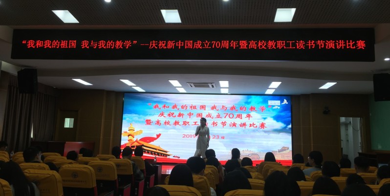 分會場設(shè)在行政樓6樓學(xué)術(shù)報告廳,舉行了“我和我的祖國 我與我的教學(xué)” 慶祝新中國成立70周年暨高校教職工讀書節(jié)演講比賽。本次演講比賽全省17所高校進入決賽,全場比賽以從踐行社會主義核心價值觀和中華民族文化自信為切入點,結(jié)合日常學(xué)科教育教學(xué)方法,準確流暢的語言表達、自然樸實的體姿,展示教師們良好的精神風(fēng)貌。