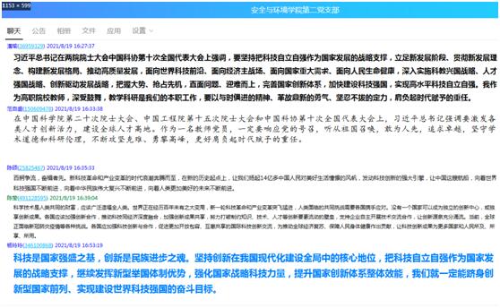 安全與環(huán)境第二黨支部黨員于8月19日集中學(xué)習(xí)了《習(xí)近平總書記在兩院院士大會(huì)、中國(guó)科協(xié)第十次全國(guó)代表大會(huì)上重要講話精神》,并在安全與環(huán)境第二黨支部QQ群里展開了熱烈討論。習(xí)近平總書記強(qiáng)調(diào)要激發(fā)各類人才創(chuàng)新活力,建設(shè)全球人才高地。硬實(shí)力、軟實(shí)力,歸根結(jié)底要靠人才實(shí)力。全部科技史都證明,誰擁有了一流創(chuàng)新人才、擁有了一流科學(xué)家,誰就能在科技創(chuàng)新中占據(jù)優(yōu)勢(shì)。我國(guó)要建設(shè)世界科技強(qiáng)國(guó),關(guān)鍵是要建設(shè)一支規(guī)模宏大、結(jié)構(gòu)合理、素質(zhì)優(yōu)良的創(chuàng)新人才隊(duì)伍,激發(fā)各類人才創(chuàng)新活力和創(chuàng)造潛力。正如習(xí)近平總書記指出的:“世界科技強(qiáng)國(guó)必須能夠在全球范圍內(nèi)吸引人才、留住人才、用好人才。我國(guó)要實(shí)現(xiàn)高水平科技自立自強(qiáng),歸根結(jié)底要靠高水平創(chuàng)新人才。”