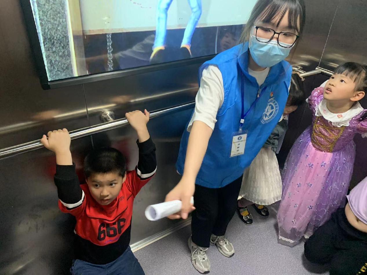 電梯墜落模擬中小朋友們按照志愿者的說明擺好防護(hù)姿勢