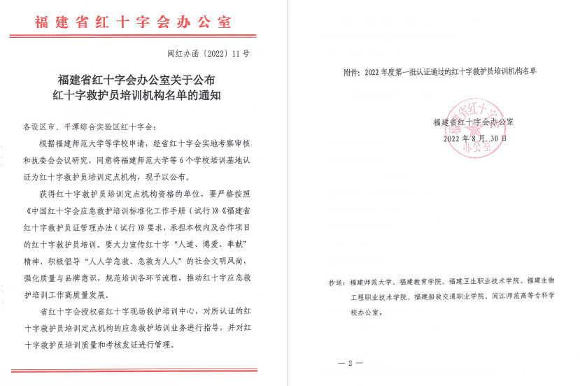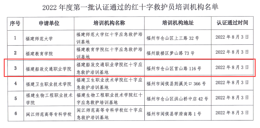 2022年7月底-8月初,在校領(lǐng)導(dǎo)的關(guān)心支持下,安全與環(huán)境學(xué)院積極準(zhǔn)備,完成“紅十字應(yīng)急救護(hù)培訓(xùn)基地”申報(bào)工作。經(jīng)福建省紅十字會(huì)實(shí)地考察審核,同意將福建船政交通職業(yè)學(xué)院認(rèn)證為紅十字救護(hù)員培訓(xùn)定點(diǎn)機(jī)構(gòu)。這標(biāo)志著福建船政交通學(xué)院正式成為2022年度第一批認(rèn)證通過的紅十字救護(hù)員培訓(xùn)機(jī)構(gòu)之一。