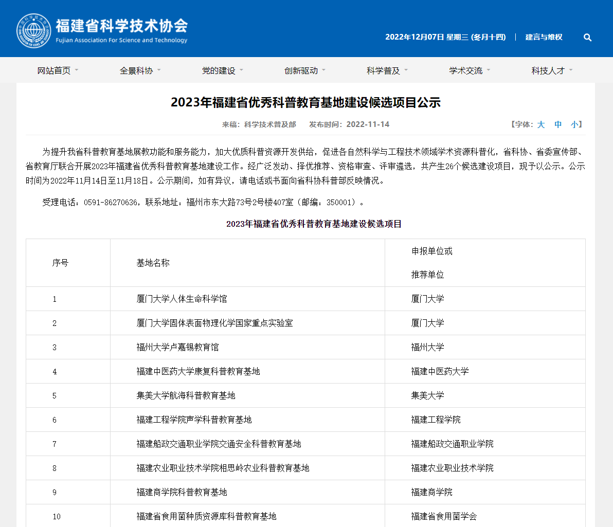 2022年8月底-9月初,在校領(lǐng)導(dǎo)的關(guān)心支持下,安全與環(huán)境學(xué)院積極籌備,完成“福建省優(yōu)秀科普教育基地”申報工作。經(jīng)福建省科學(xué)技術(shù)協(xié)會考察遴選,獲批“福建省優(yōu)秀科普教育基地”建設(shè)。