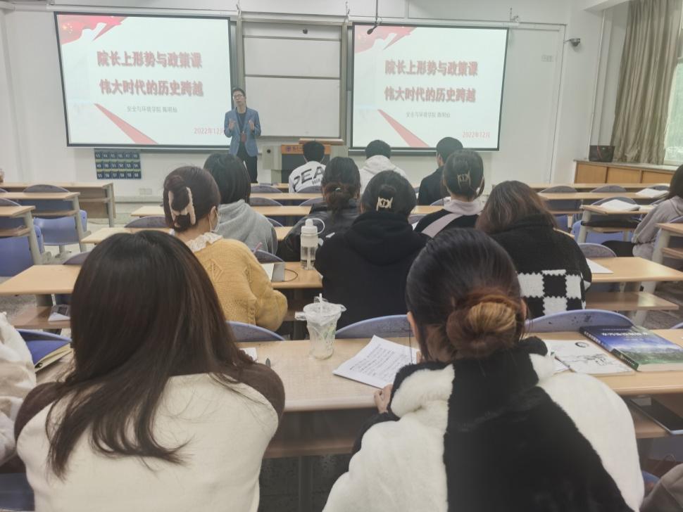 為更好貫徹落實中辦、國辦《關于深化新時代學校思想政治理論課改革創(chuàng)新的若干意見》,中組部、中宣部、教育部《關于領導干部上講臺開展思想政治教育的意見》及省委教育工作領導小組《關于深化新時代學校思想政治理論課改革創(chuàng)新行動方案》,安全與環(huán)境學院院長陳明仙參與思政教研室的集體備課,于2022年12月8日,給安全與環(huán)境學院學生講授思政課、講授以“偉大時代的歷史跨越”為主題的形勢與政策課。