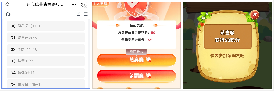我院于6月19日接到通知的第一時(shí)間,將《福建省防范和處置非法集資工作領(lǐng)導(dǎo)小組辦公室轉(zhuǎn)發(fā)處置非法集資部際聯(lián)席會(huì)議辦公室關(guān)于邀請(qǐng)參加第三屆全國(guó)防范非法集資知識(shí)答題賽的函》發(fā)布工作群中,鼓勵(lì)教職工積極參加熱身賽,多位老師在熱身賽中獲得滿分50分。