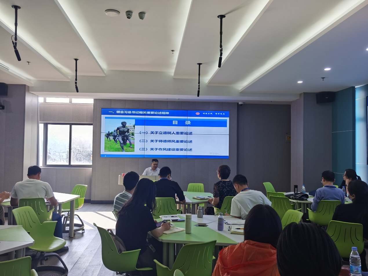 劉有升教授以“加強(qiáng)師德師風(fēng)建設(shè) 落實(shí)立德樹人根本任務(wù)”為題,首先從領(lǐng)會(huì)習(xí)近平總書記 “關(guān)于立德樹人”、“關(guān)于師德師風(fēng)”、“關(guān)于作風(fēng)建設(shè)”重要論述精神講起,詳細(xì)介紹了新時(shí)代教師要如何立德樹人,引導(dǎo)全體教職工結(jié)合自己的本職崗位,圍繞師德師風(fēng)建設(shè)進(jìn)行深度思考,認(rèn)識(shí)到教師職業(yè)道德的重要性。其次,深入剖析了教育部公開曝光的第十三批違反教師職業(yè)行為準(zhǔn)則典型案例。最后,從“加強(qiáng)思想引領(lǐng)”、“熟悉制度規(guī)定”、“健全監(jiān)督評(píng)價(jià)”、“重在日常養(yǎng)成”四個(gè)方面闡述如何做好師德師風(fēng)建設(shè)。