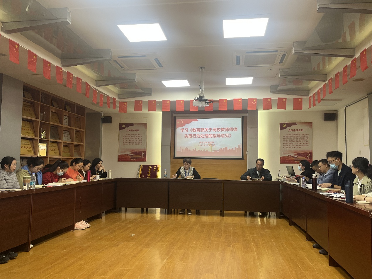 會上,鄭雪琴書記帶領(lǐng)全體教職工學習了教育部關(guān)于推開教職員工準入查詢工作的通知》(教師函〔2023〕1號)、《教育部關(guān)于高校教師師德失范行為處理的指導意見》(教師[2018]17號)、《事業(yè)單位工作人員處分暫行規(guī)定》(人力資源和社會保障部、監(jiān)察部令第18號)、習近平文化思想等師德師風相關(guān)文件,引導廣大教師堅定理想信念,陶冶道德情操,涵養(yǎng)扎實學識,勤修仁愛之心,堅守三尺講臺,潛心教書育人,堅守底線與紅線,嚴格要求自己,不斷完善自己。