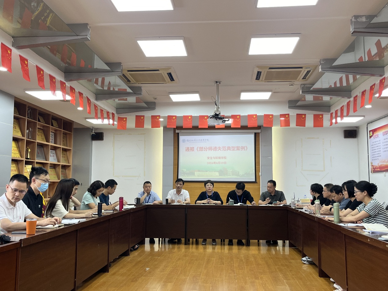 為深入貫徹落實黨的二十大精神,加強師德師風(fēng)建設(shè),嚴明底線意識,規(guī)范教師職業(yè)行為,營造風(fēng)清氣正的育人環(huán)境,6月19日下午,安全與環(huán)境學(xué)院召開黨紀學(xué)習(xí)教育暨師德師風(fēng)專題警示教育會。會議由黨總支書記鄭雪琴同志主持,學(xué)院全體教師參加。