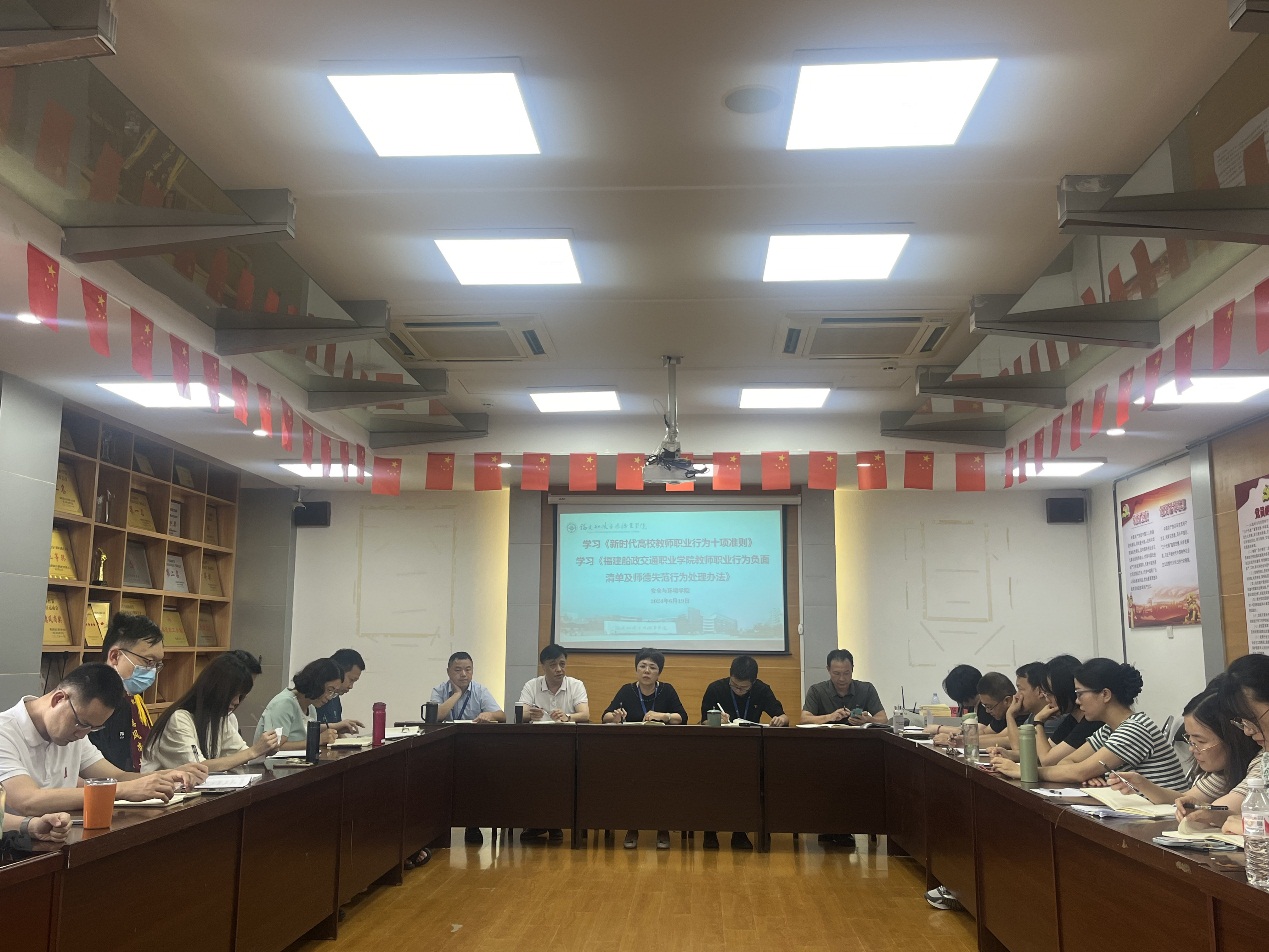 接著,范自盛副院長解讀了《福建船政交通職業(yè)學(xué)院教師職業(yè)行為負面清單及師德失范行為處理辦法》,幫助全體教職工深入了解文件條款。全體教職員工要有底線思維,要自覺加強師德修養(yǎng),嚴格遵守師德規(guī)范,嚴以律己,為人師表,把教書育人和自我修養(yǎng)結(jié)合起來,堅持以德立身、以德立學(xué)、以德施教、以德育德。