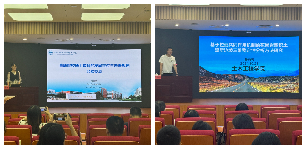 在活動(dòng)的分享發(fā)言環(huán)節(jié),安全與環(huán)境學(xué)院傅鈺瑛博士和土木工程學(xué)院曾錦秀博士分別以《高職院校博士教師的發(fā)展定位與未來規(guī)劃經(jīng)驗(yàn)交流》和《基于拉剪共同作用機(jī)制的花崗巖殘積土路塹邊坡三維穩(wěn)定性分析方法研究》為主題做經(jīng)驗(yàn)分享,多位博士教師就項(xiàng)目研究及課題申報(bào)中遇到的瓶頸和疑問與陳教授展開積極互動(dòng),進(jìn)行交流研討。