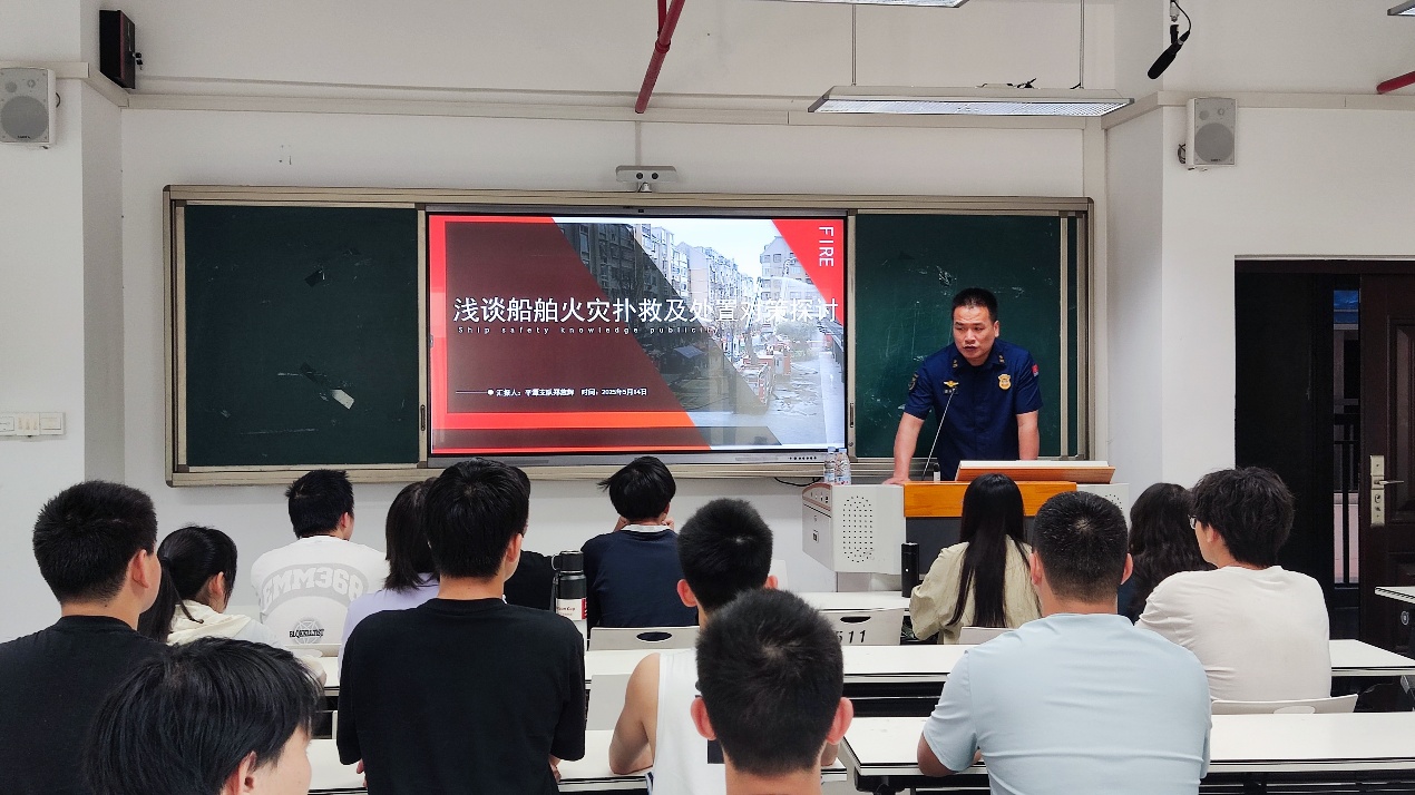 講座中,鄭燕輝結合自身從事消防救援,特別是近年來從事船舶火災撲救的經(jīng)歷,介紹了船舶火災撲救的典型戰(zhàn)例,闡述了船舶火災的基礎知識、船舶火災處置程序、船舶火災撲救的注意事項等內(nèi)容,并針對船舶火災撲救提了幾點思考。通過講座,拓展了學生關于消防員的崗位職業(yè)技能和船舶火災撲救的技能,極大調(diào)動學生對于從事消防救援工作的興趣。鄭燕輝還給學生提出了職業(yè)發(fā)展規(guī)劃方面的建議,期待學生有志加入消防救援隊伍。講座后,學生針對船舶火災和消防員職業(yè)發(fā)展等問題與鄭燕輝站長進行了廣泛交流。