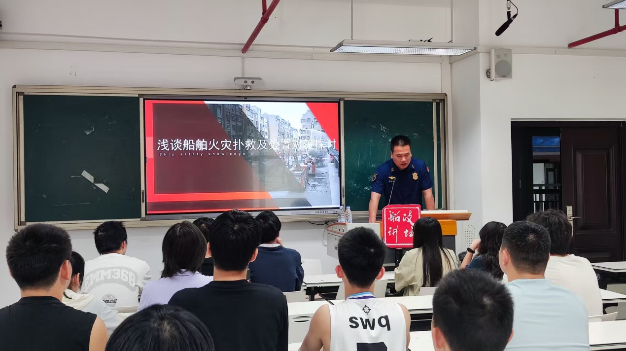 講座中,鄭燕輝結(jié)合自身從事消防救援,特別是近年來從事船舶火災撲救的經(jīng)歷,介紹了船舶火災撲救的典型戰(zhàn)例,闡述了船舶火災的基礎知識、船舶火災處置程序、船舶火災撲救的注意事項等內(nèi)容,并針對船舶火災撲救提了幾點思考。通過講座,拓展了學生關于消防員的崗位職業(yè)技能和船舶火災撲救的技能,極大調(diào)動學生對于從事消防救援工作的興趣。鄭燕輝還給學生提出了職業(yè)發(fā)展規(guī)劃方面的建議,期待有志學生加入消防救援隊伍。