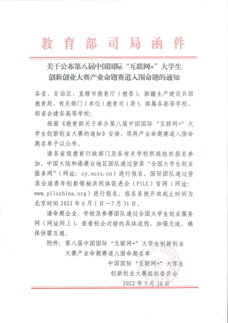 關(guān)于公布第八屆中國(guó)國(guó)際“互聯(lián)網(wǎng)+”大學(xué)生創(chuàng)新創(chuàng)業(yè)大賽產(chǎn)業(yè)命題賽道入圍命題的通知