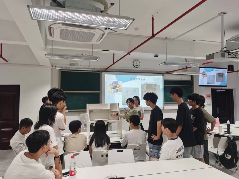 活動(dòng)第一階段是基地班學(xué)生創(chuàng)意作品展示?;匕鄬W(xué)生展示了五款學(xué)生床上桌創(chuàng)意設(shè)計(jì)作品,福建歐格森家具制造有限公司陳明娟總經(jīng)理觀看作品后給予了充分的肯定,并針對(duì)存在問(wèn)題和修改建議等對(duì)學(xué)生進(jìn)行詳細(xì)的指導(dǎo)。同學(xué)們興致高漲,圍著陳明娟總經(jīng)理不停請(qǐng)教、探討,一張床上小桌點(diǎn)燃同學(xué)們的創(chuàng)新激情。