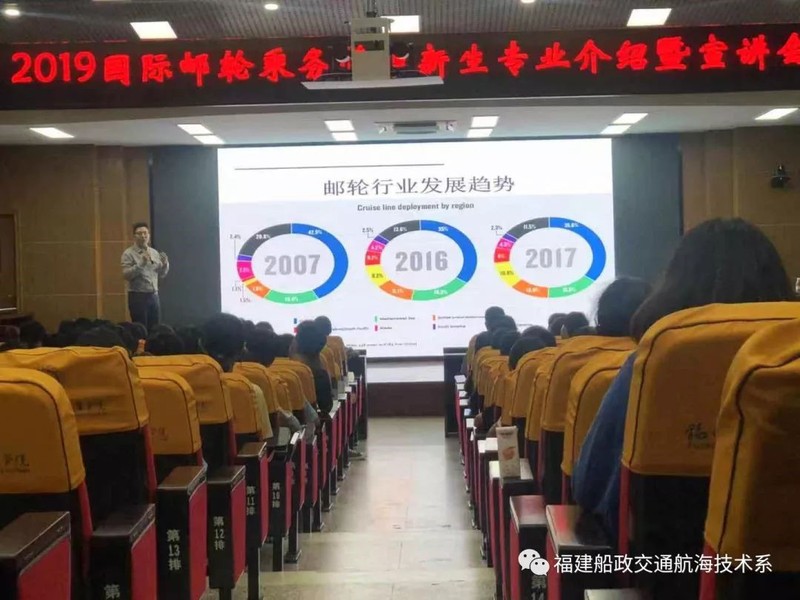為使我系19級(jí)國(guó)際郵輪乘務(wù)新生能夠更快適應(yīng)大學(xué)生活,了解自己所學(xué)專業(yè),明確學(xué)習(xí)目標(biāo),增強(qiáng)學(xué)習(xí)動(dòng)力。航海技術(shù)系于2019年9月9日19點(diǎn)在一號(hào)樓學(xué)術(shù)報(bào)告廳開展了“2019級(jí)國(guó)際郵輪乘務(wù)管理新生專業(yè)介紹暨宣講講座”。并邀請(qǐng)廈門海陸海事服務(wù)有限公司郵輪面試官李樂天先生、航海技術(shù)系副主任翁國(guó)玲老師和黃超夷老師參加本次宣講。