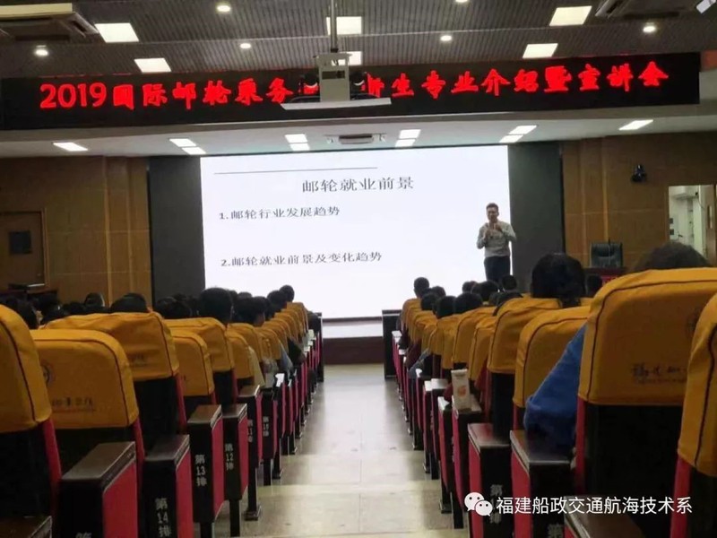 為使我系19級(jí)國(guó)際郵輪乘務(wù)新生能夠更快適應(yīng)大學(xué)生活,了解自己所學(xué)專業(yè),明確學(xué)習(xí)目標(biāo),增強(qiáng)學(xué)習(xí)動(dòng)力。航海技術(shù)系于2019年9月9日19點(diǎn)在一號(hào)樓學(xué)術(shù)報(bào)告廳開展了“2019級(jí)國(guó)際郵輪乘務(wù)管理新生專業(yè)介紹暨宣講講座”。并邀請(qǐng)廈門海陸海事服務(wù)有限公司郵輪面試官李樂天先生、航海技術(shù)系副主任翁國(guó)玲老師和黃超夷老師參加本次宣講。
