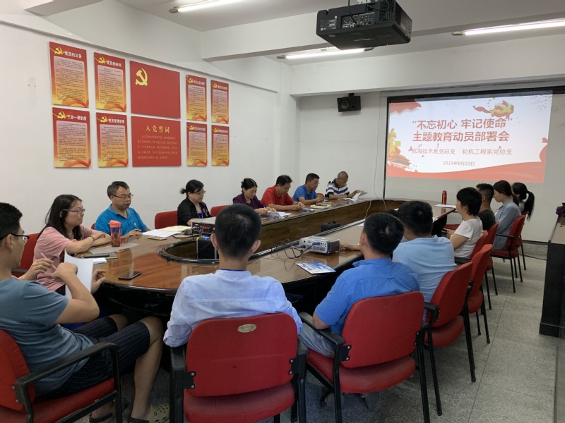 2019年9月20日下午,航海學(xué)院黨總支在校友樓四樓會(huì)議室召開了“不忘初心、牢記使命”主題教育動(dòng)員部署會(huì),學(xué)院黨委巡回指導(dǎo)三組組長(zhǎng)謝翠紅及指導(dǎo)組成員,航海技術(shù)黨政負(fù)責(zé)人,全體教工黨員、學(xué)生黨員代表參會(huì)。會(huì)議由系主任江明光主持。