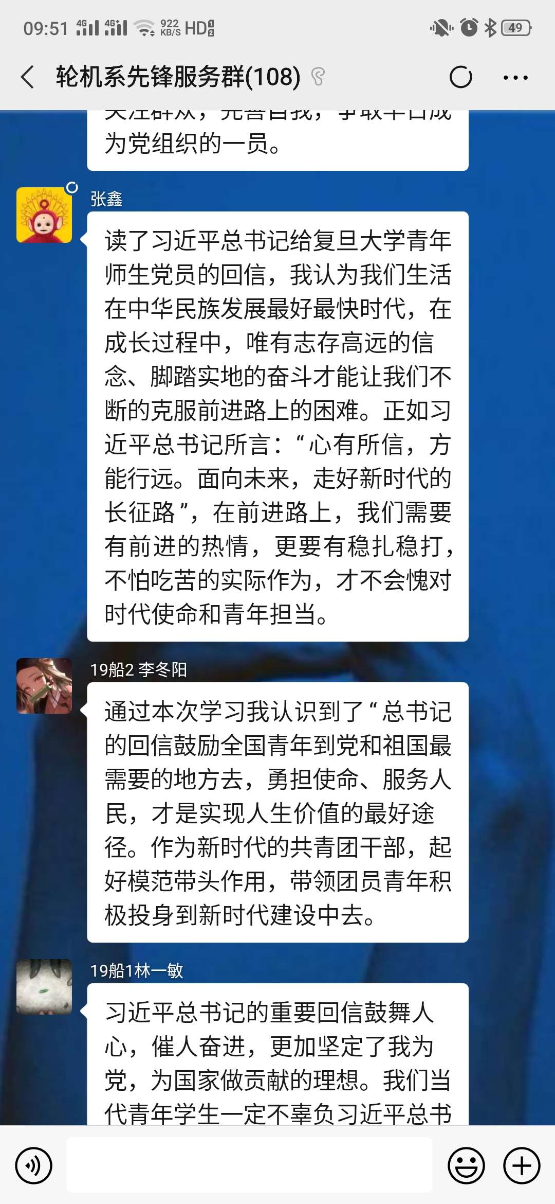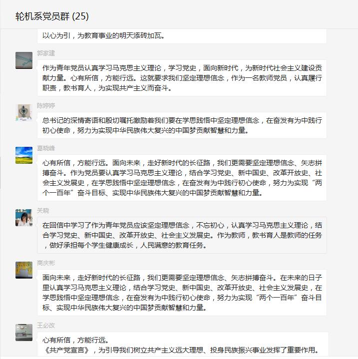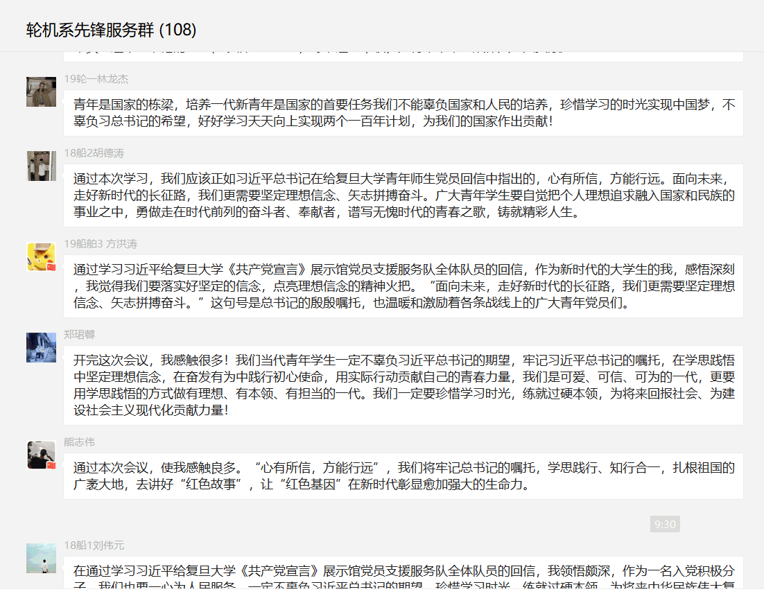 座談會后,大家心情特別激動,紛紛踴躍在輪機系先鋒服務(wù)群、輪機系黨員群里接龍分享心得,抒發(fā)學習感悟: