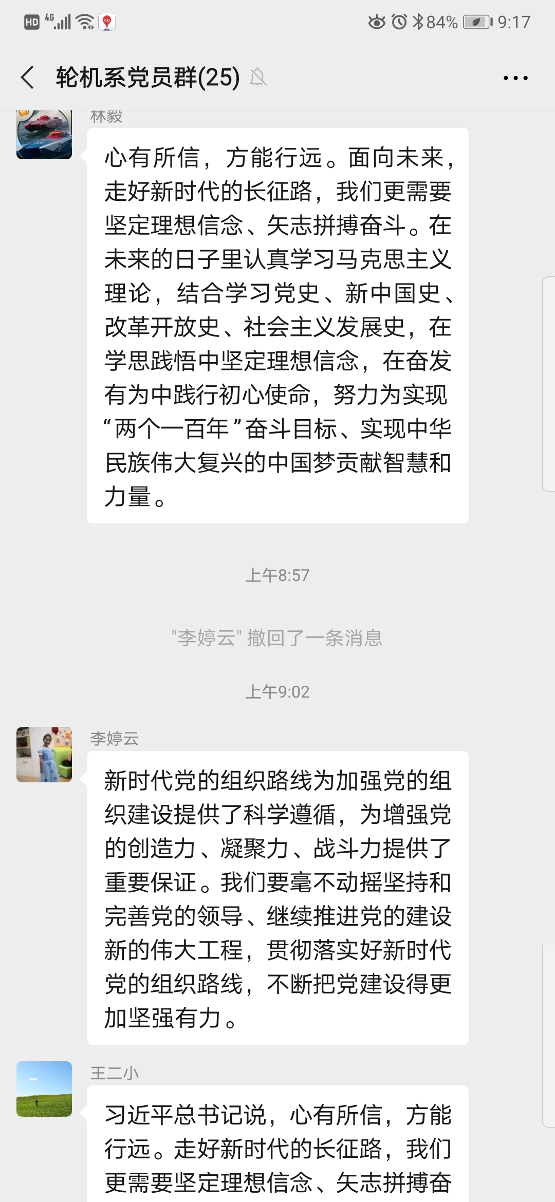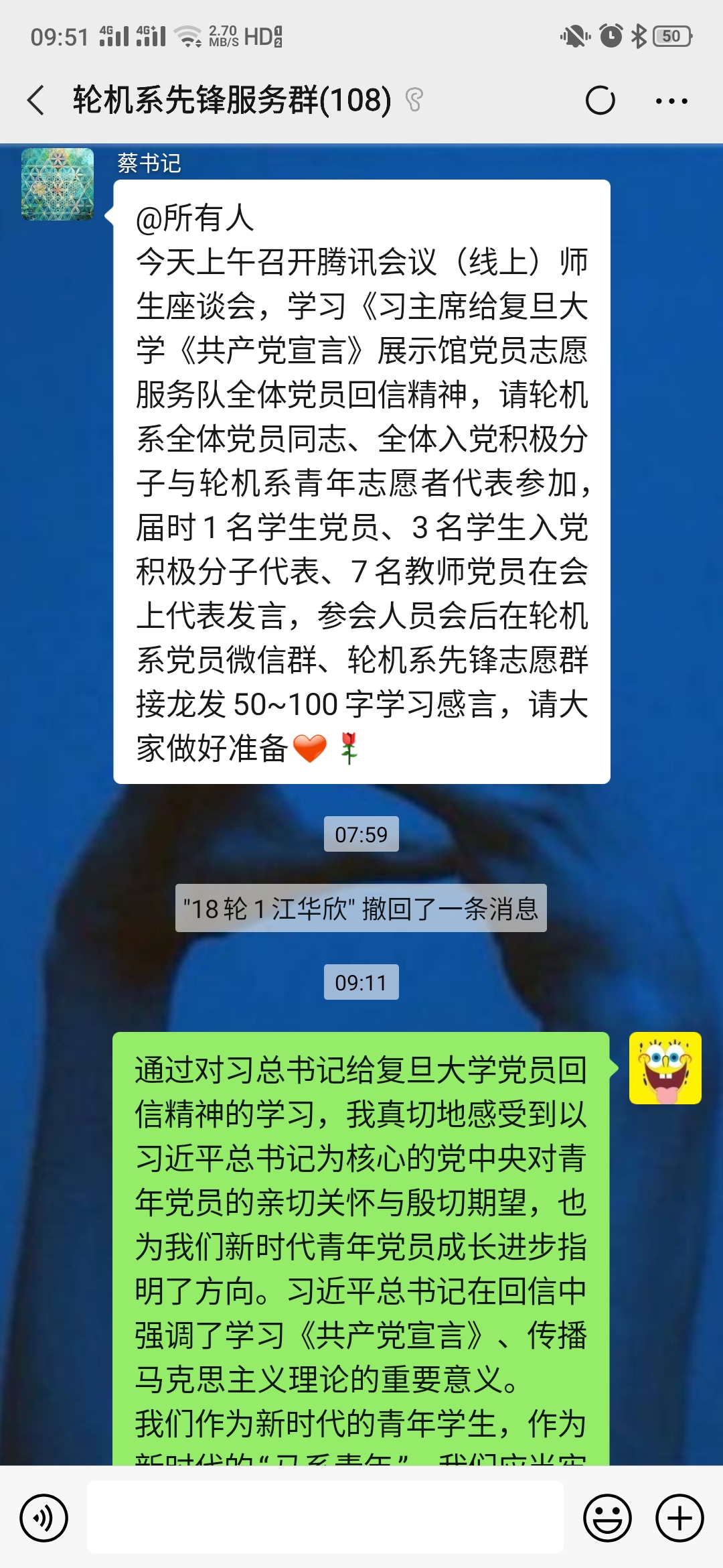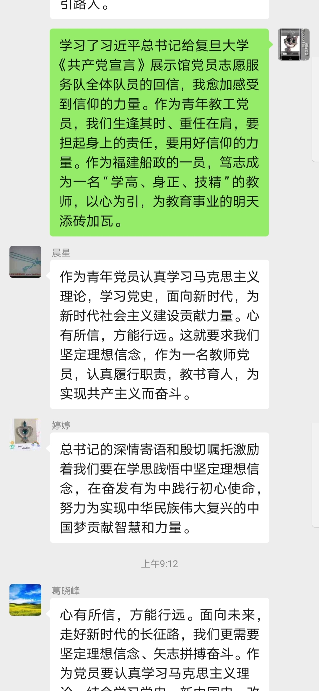 座談會后,大家心情特別激動,紛紛踴躍在輪機系先鋒服務(wù)群、輪機系黨員群里接龍分享心得,抒發(fā)學習感悟: