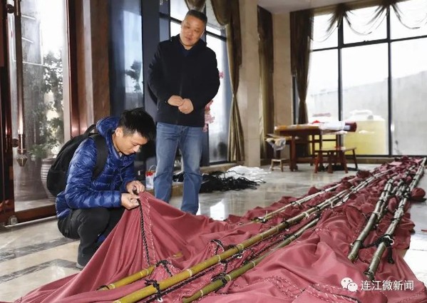 “心瀾號”總設(shè)計(jì)師、福建船政交通職業(yè)學(xué)院航海學(xué)院教師江金春(左)在檢查風(fēng)帆