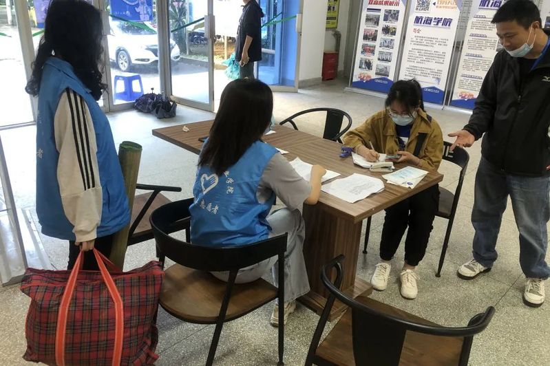 進(jìn)入校園,體溫測量、掃碼登記,48小時核酸核驗、行程卡、健康碼核驗。在校友之家“一站式”報到服務(wù),返校材料收集,床上用品發(fā)放。