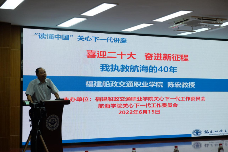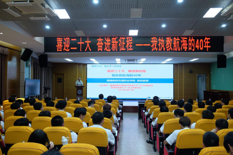 2022年6月15日晚,由學(xué)院關(guān)工委主辦,航海學(xué)院承辦的福建船政交通職業(yè)學(xué)院“讀懂中國”關(guān)心下一代講座在北區(qū)一號樓學(xué)術(shù)廳成功舉辦。陳宏教授為現(xiàn)場的同學(xué)們做了題為《喜迎二十大 奮進(jìn)新征程 —我執(zhí)教航海的40年》的講座。講座由航海學(xué)院黨總支書記江文主持,福建省教育系統(tǒng)關(guān)工委副主任陳晃和關(guān)工委副秘書長兼辦公室主任羅文倩到場蒞臨指導(dǎo)。