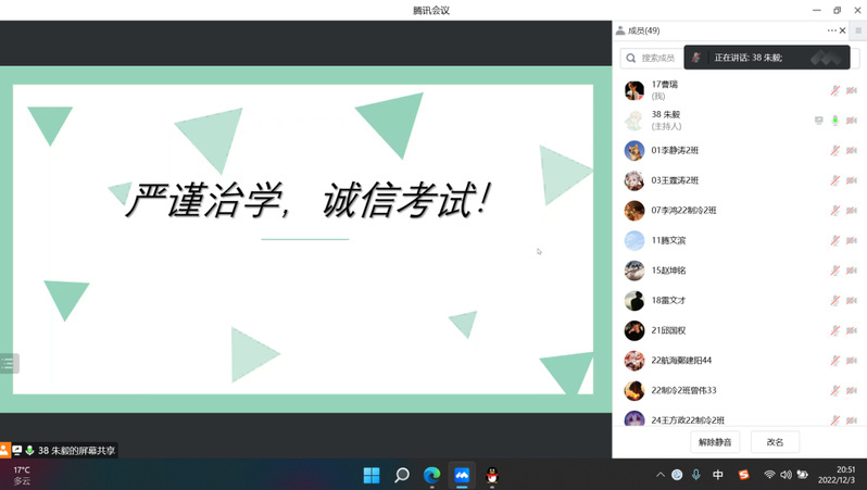 誠實(shí)守信是中華民族的傳統(tǒng)美德,本學(xué)期也將迎來我們的期末考試。為加強(qiáng)學(xué)風(fēng)建設(shè),端正考風(fēng)考紀(jì),抵制考試作弊等不良風(fēng)氣,引導(dǎo)學(xué)生誠信考試、誠信做人。航海學(xué)院于近日組織各班學(xué)習(xí)委員面向各班級(jí)召開“嚴(yán)謹(jǐn)治學(xué),誠信考試”主題班會(huì)。
