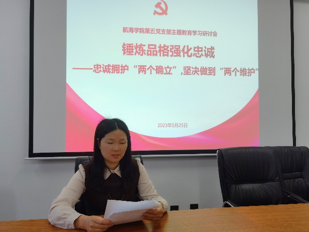 航海學(xué)院第五黨支部于2023年5月25日在校友樓307召開(kāi)主題教育學(xué)習(xí),研討專題-錘煉品格強(qiáng)化忠誠(chéng)—— 忠誠(chéng)擁護(hù)“兩個(gè)確立”,堅(jiān)決做到“兩個(gè)維護(hù)”,專題主要發(fā)言人為張秋霞老師。